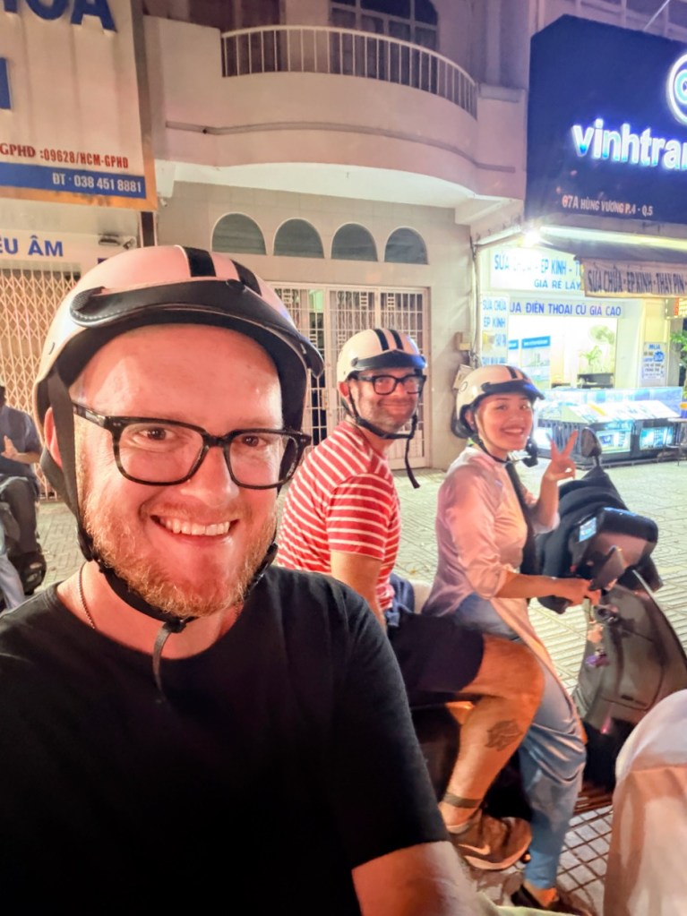 We each hopped on the back of a motorbike and plunged straight into the chaos of Ho Chi Minh traffic.