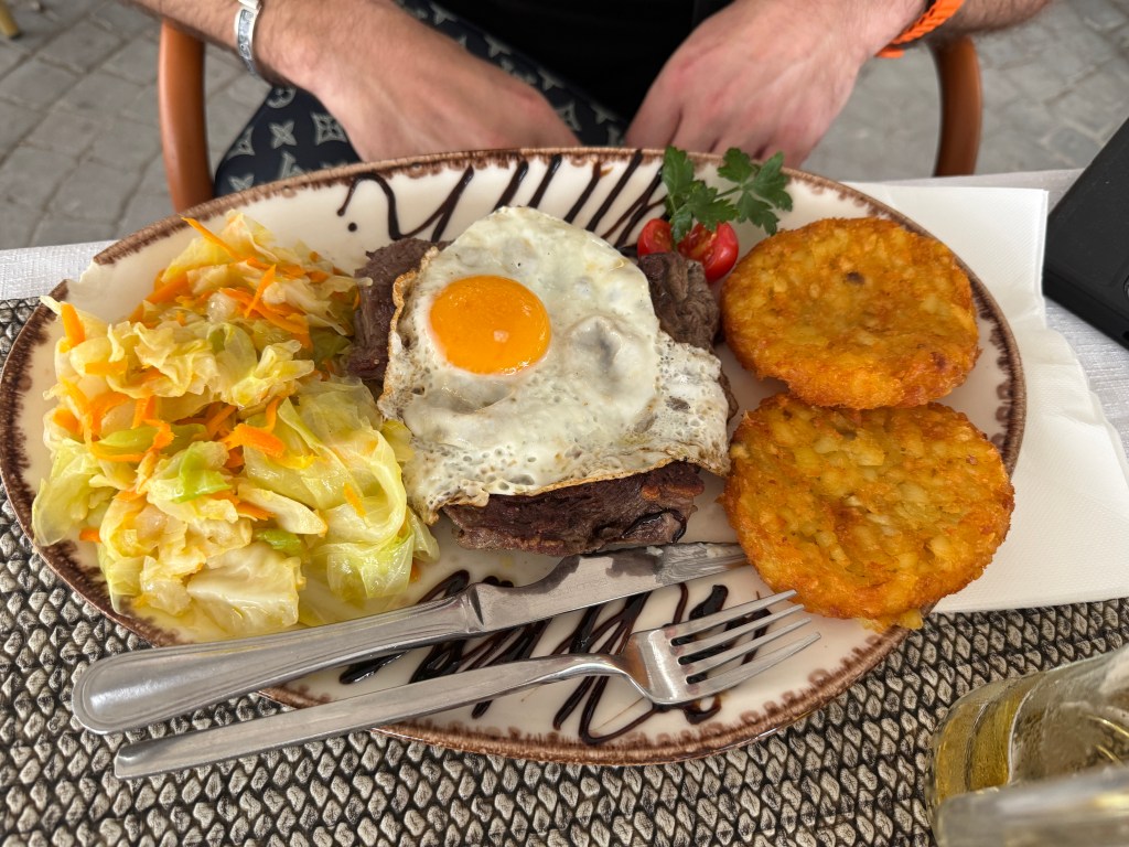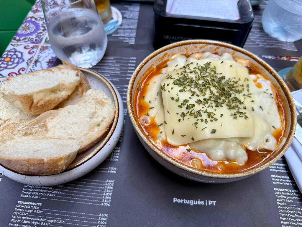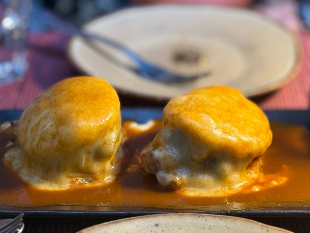 Of course, we couldn’t skip Porto’s signature dish: the Francesinha. Imagine a decadent sandwich layered with cured ham, fresh sausage, and steak, covered in melted cheese, then drenched in a rich tomato-and-beer sauce. It’s indulgent, messy, and unforgettable.