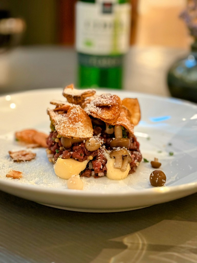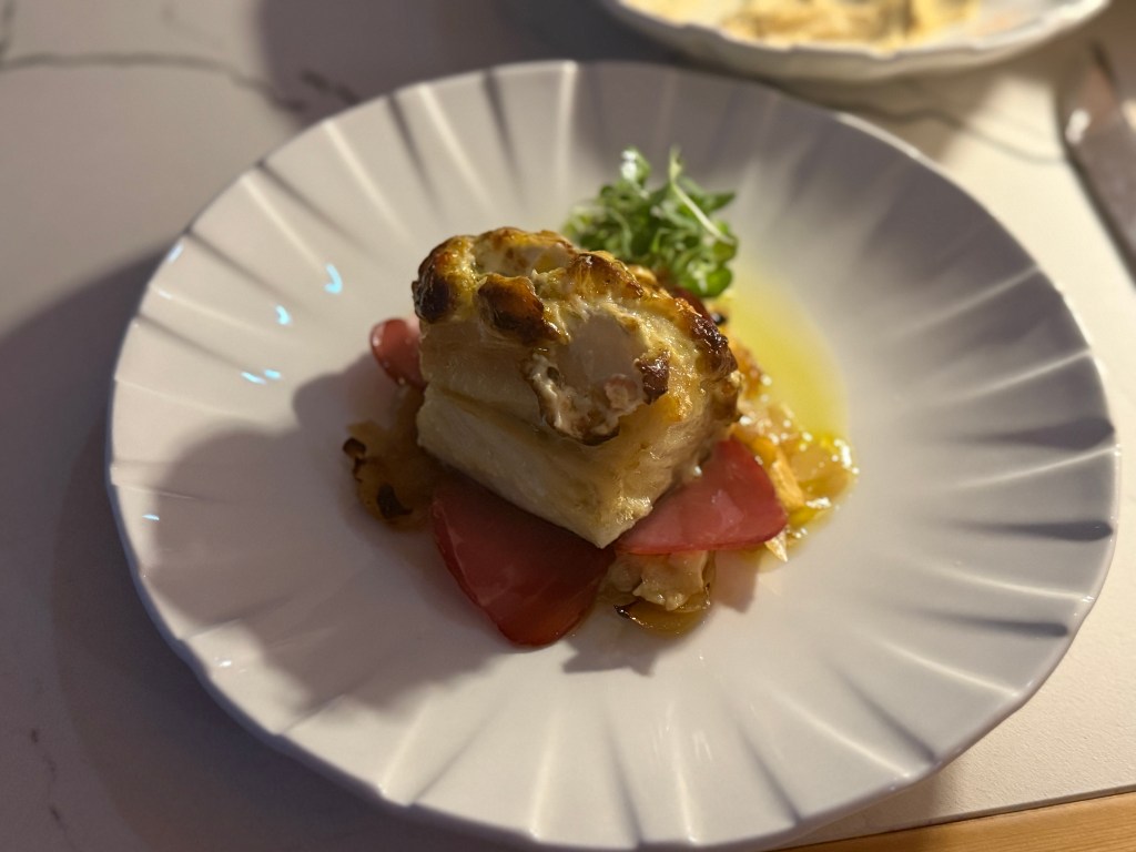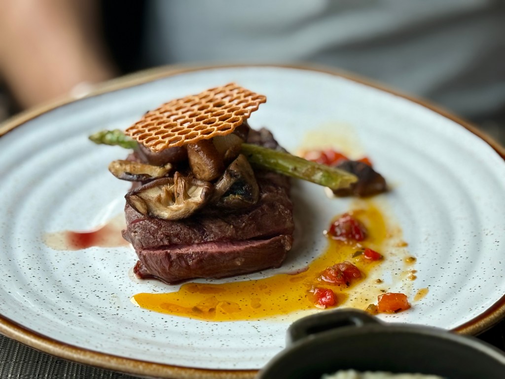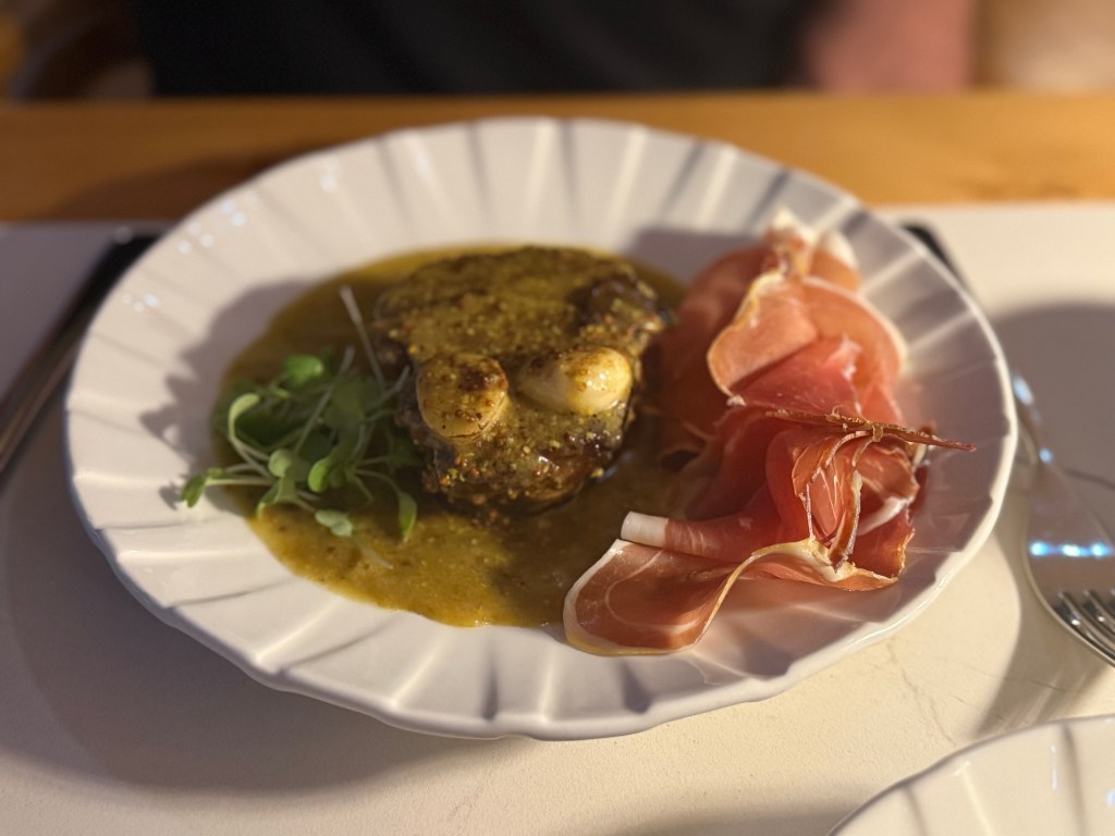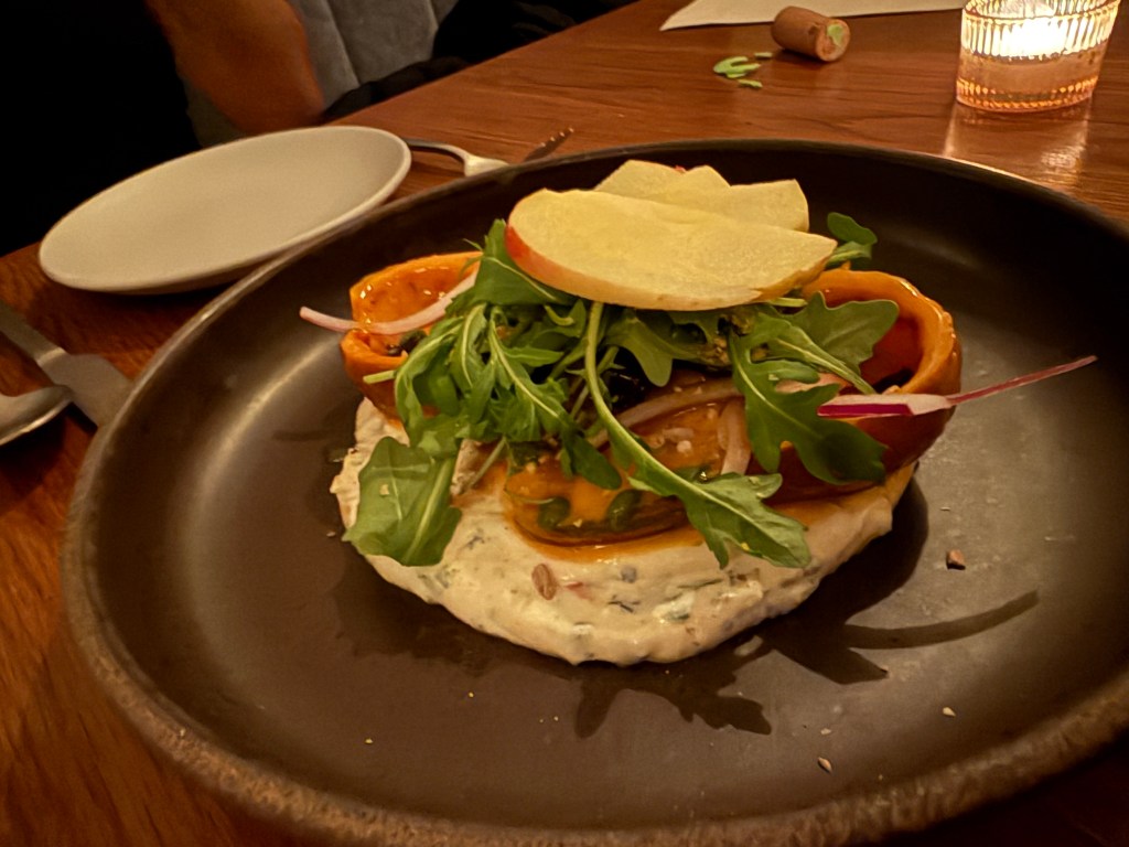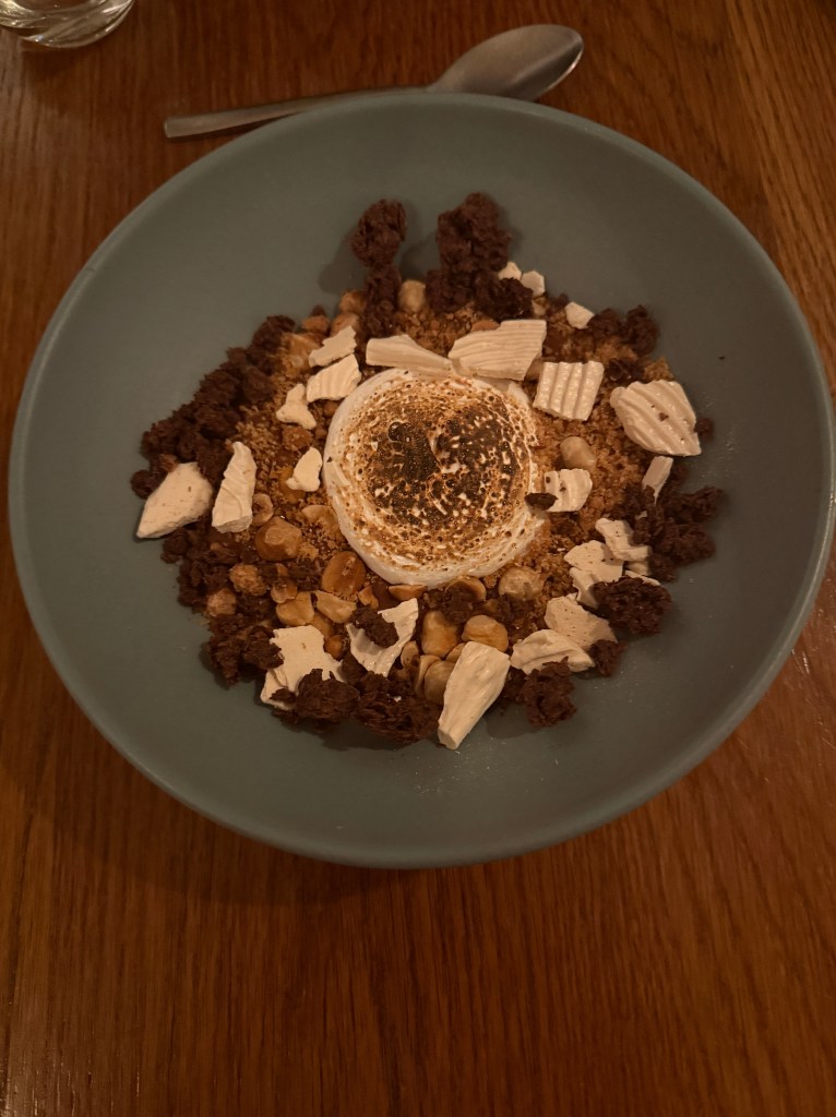 Casey started with oysters he insists were the best he’s ever had, while I went with a bright, perfectly balanced ceviche. The surprise standout? A butternut squash second course recommended by our server — unbelievably scrumptious and the perfect hint of fall. Our mains (pork for Casey and fish for me) were excellent, but dessert stole the show: a deconstructed s’mores masterpiece. Drinks? Also perfection.