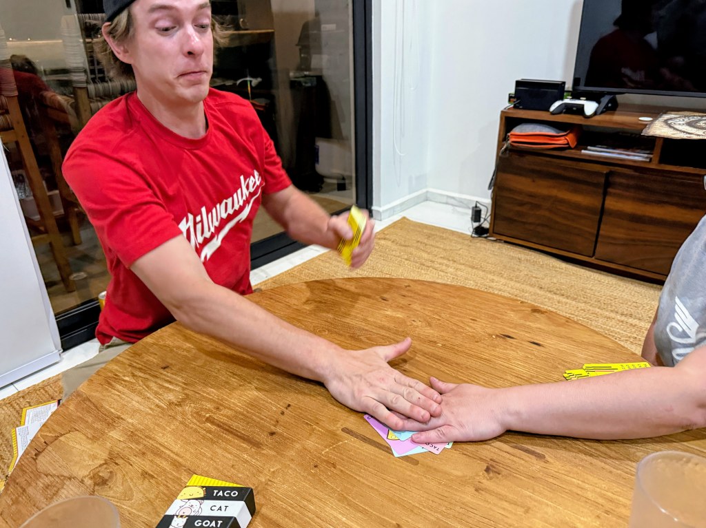 We’ve been lucky to have family join us for most of our stay. Casey’s sister Brittney and her boyfriend Nick arrived the day after we did and stayed a week. Our highlight? A chaotic, laugh-until-you-cry game night playing Taco, Cat, Goat, Cheese, Pizza. It’s simple, silly, and with Nick’s epic sore-loser energy, absolutely hilarious. I have an entire album of him competing with Brittney for a title that technically doesn’t exist: “not last place.”